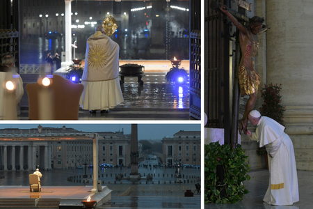 Pope Francis prays for an end to the pandemic in St. Peter’s Square on March 27, 2020.