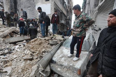Syrians search for victims and survivors at the rubble a collapsed building in the city of Aleppo following a deadly earthquake on February 6, 2023.