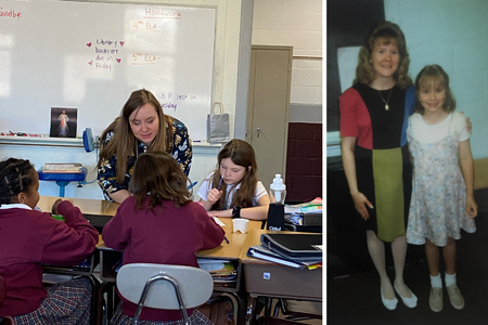 L to R: Kristin Urbanski teaches at St. Joseph School in Fullerton, Maryland, where she attended as a student. She is shown as a first-grader with her teacher, Donna Visalli, in 1995. Visalli now works as an instructional assistant for Urbanski’s class.