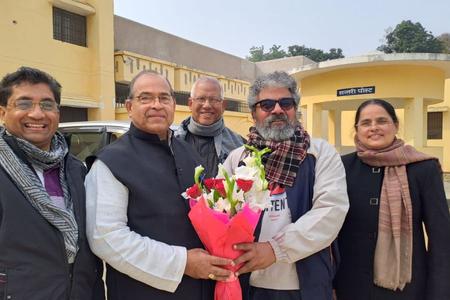Bishop Louis Mascarenhas of Allahabad greets Father Babu Francis at the gate of Naini jail in Prayagraj district with a bouquet of flowers.