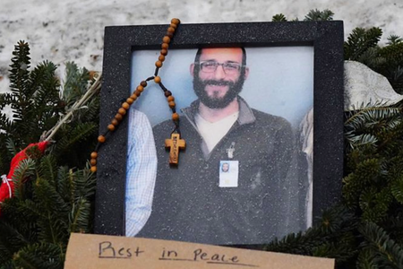 A picture of Alex Pretti is left at a makeshift memorial on Jan. 25 in the area where Pretti was shot dead a day earlier by federal immigration agents in Minneapolis.