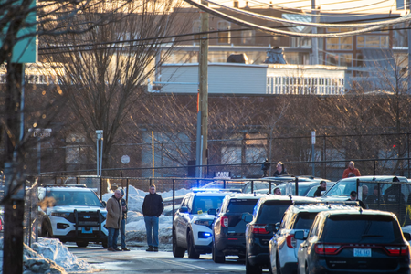 Police stand outside the perimeter they created around the Dennis M. Lynch Arena where a shooting occurred in Pawtucket, Rhode Island, Monday, Feb. 16, 2026.