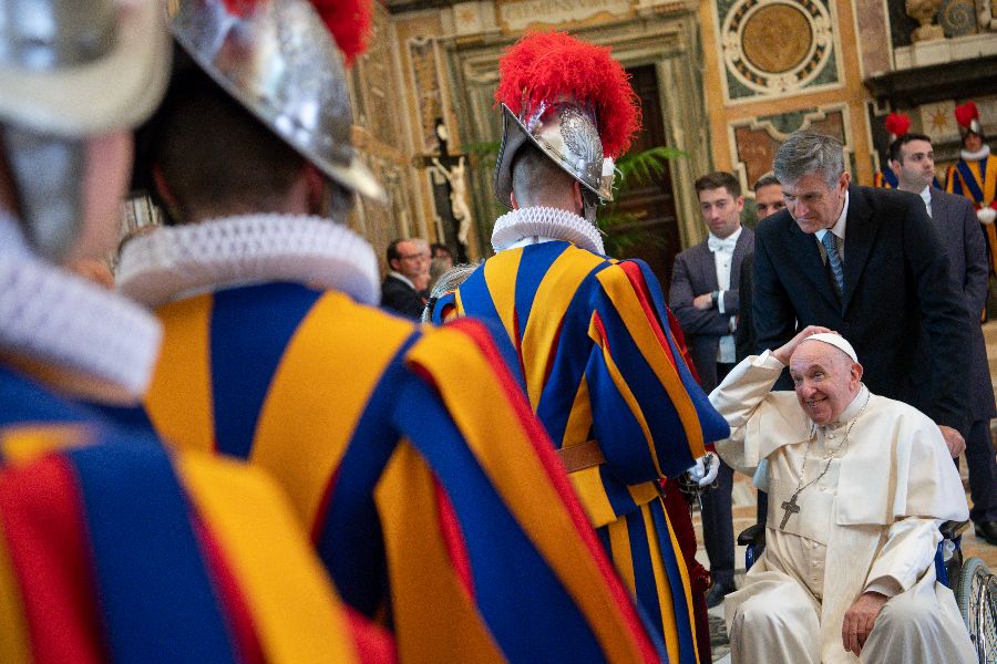 Pope Francis with new Swiss Guard recruits in the Vatican’s Clementine Hall on May 6, 2022.