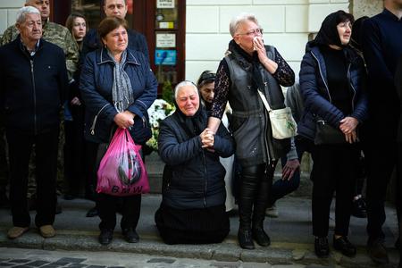 Galina Malets (c) drops to her knees as she sees the coffin of her brother at Sts. Peter and Paul Garrison Church Thursday. Her brother, Igor Malets, a 59-year-old soldier, was wounded April 27 in Izyum and died April 30 in the hospital in Dnipro.