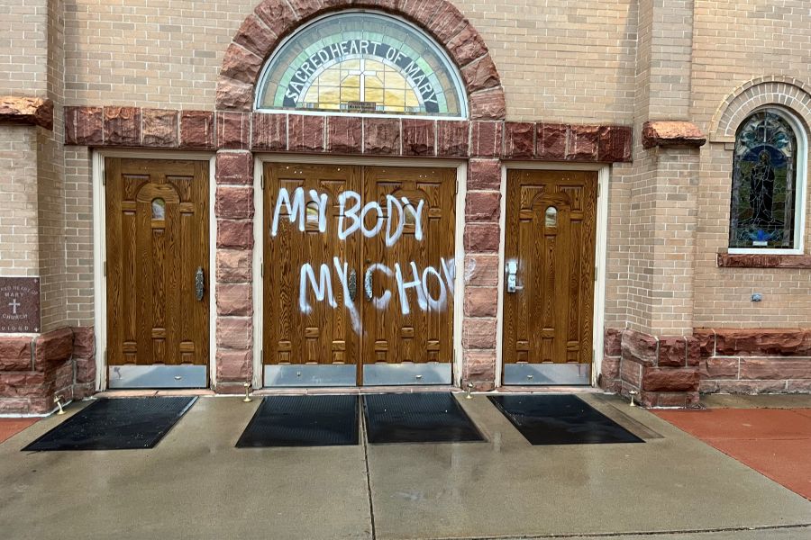 Pro-abortion graffiti on the doors of Sacred Heart of Mary Catholic Church in Boulder, Colorado, on May 4, 2022.