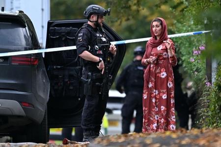 An armed police officer talks to a member of the local community outside Heaton Park Hebrew Congregation synagogue in Crumpsall, north Manchester, England, on Thursday, Oct. 2, 2025.
