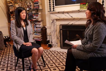 L to R: Claire Lai speaks to Montse Alvarado during an interview on ‘EWTN News Nightly.’