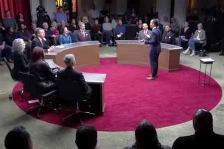 Panelists take part in a discussion on life issues during a taping of PBS’ ‘Breaking the Deadlock’ in New York.